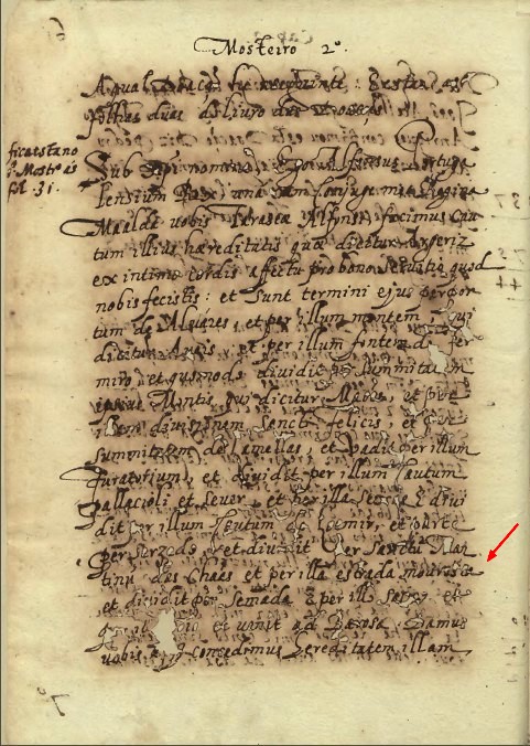 A seta vermelha indica a passagem do texto onde se refere a estrada mourisca como limite norte do couto do mosteiro e dividia este com Semada, lugar hoje designado por Queimada: "et per illa estrada mourisca et dividit per Semada". Presumivelmente esta dita «estrada mourisca» seria já utilizada em período romano e deverá corresponder ao estradão que segue pelo planalto do Monte Raso que integra um grande itinerário que ligava a travessia do Rio Douro na Régua a Moimenta da Beira talvez rumo a Mérida (ver aqui itinerário).