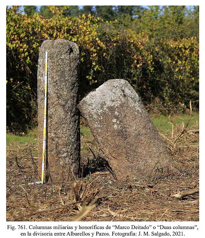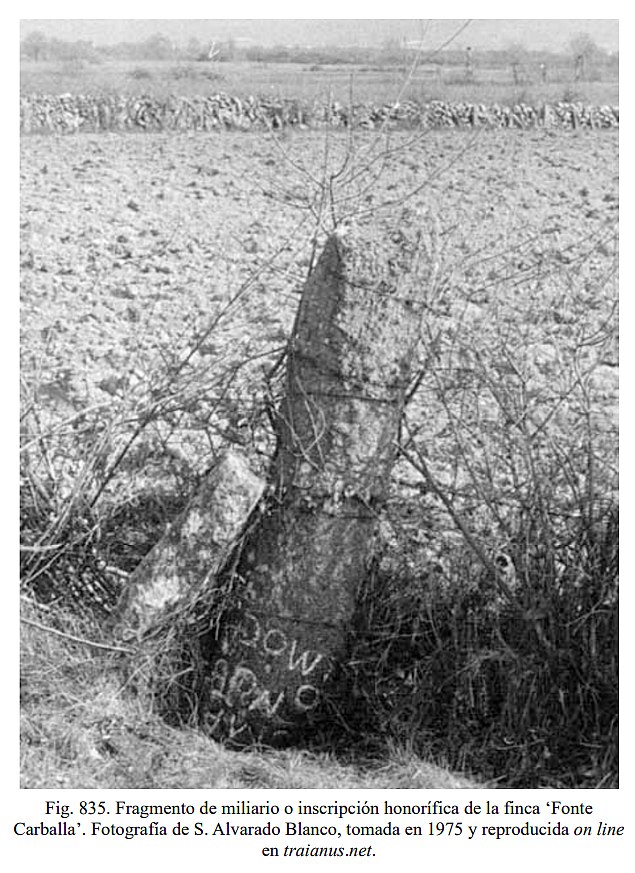 Évora (EBORA) - Beja (PAX IULIA) m.p. XLIV A via romana ligando Évora à capital do conventus pelo caminho mais curto, cerca de 44 milhas, é atestada pelos imensos vestígios ao longo do seu percurso, contando-se actualmente pelo menos 16 miliários na sua maioria anepígrafos (seriam pintados?), assim como alguns troços da calçada. André de Resende refere que existiam numerosos vestígios desta via no seu tempo, mormente vários miliários, lendo num deles que era do tempo de Adriano (Resende, 1593:156; CIL II 432*); menciona também pontes já arruinadas sobre rios Xévora, Murteira e Odivelas; nos anos 50 do século passado, Mário Saa voltou a realçar a importância dos vestígios ainda visíveis ao longo da via que designa por «Estrada dos Diabos» (Saa 1963:238-240). Entretanto muitos destes vestígios já foram entretanto destruídos com a excepção do miliário da Camoeira que ao ser levado para Évora foi poupado a esse infortúnio. Urge estabelecer medidas de protecção desta via cujos poucos vestígios remanescentes continuam ao abandono e sujeitos a progressivas destruições. O traçado ainda suscita algumas interrogações, em particular em duas possíveis variantes por Alvito e Cuba (Sillières, 1984; Encarnação, 184:724; M. C. Lopes, 2000; Bilou, 2000a; Feio, 2010; Mantas, 2012c). Na sua parte inicial, a via servia de limite entre o concelho de Alvito e o de Évora em 1251, segundo consta na carta de demarcação do couto de Alvito «(...) Carrariam veterem quod venit de elbora pro ad begiam ad patronum qui stat in ripa de aqua de udivelis et de inde eundo directe per ipse viam veterem ad patronum qui stat in ripa de cabelete (...)»; os referidos marcos («patronum») deverão corresponder a miliários romanos desta via, um junto do cruzamento da ribeira de Odivelas e o outro no Monte do Cavalete, local de onde partia uma variante por Alvito (Feio, 2010). Évora (EBORA) (partindo da Porta do Raimundo em Évora, seguia pela Horta do Bispo, onde existia um troço de calçada (Pereira, 1948:303), continuando pelo Bairro da Ns. do Carmo rumo à travessia da ribeira da Torregela junto à Herdade da Barbarrala Nova, onde há vestígios de lajeado no vau da ribeira, continuando depois pela Herdade da Casinha) Monte das Flores (m.p. IV; a via segue a margem direita do rio Xarrama) Fontalva (m.p. VII; 4 fragmentos de miliários; o miliário de Fontalva 1 está tombado entre o rio Xarrama e o acesso ao monte; o miliário de Fontalva 2 permanece erecto in situ; o miliário de Fontalva 3 é anepígrafo; o miliário de Fontalva 4 está tombado no leito do rio, partido em 2 fragmentos; a via continua paralela ao Xarrama) Monte do Seixo (m.p. VIII; Mário Saa refere um miliário na «Fonte do Seixo») Porto da Magalhoa (m.p. IX; referência a um miliário; Mário Saa refere três miliários entre o Monte da Magalhoa e o Monte da Zambujeira, um deles conhecido por «Marca do Diabo») Torre/Solar da Camoeira (m.p. XI; provável mutatio de onde provém o miliário de Maximino I e ao seu filho Máximo, IRCP 664a, indicando 11 milhas a Évora, entretanto transferido para a entrada dos serviços administrativos da antiga JAE na cidade de Évora; segundo Saa apareceu «no leito do Xarrama, a cerca de 800 m a montante da desaparecida ponte do Porto da Calçadinha», junto com outros fragmentos que serviam de poldras no chamado «Porto da Camoeira») Travessia do rio Xarrama (segue 200 m paralela ao rio até à Azenha do Silveira onde existe calçada; continua pelo Porto da Calçadinha onde reaparece a calçada durante 300 m; continuando pela extrema que divide as Herdades da Falcoeira e da Ovelheira por 1500 m, junto do marco geodésico de Aguilhão) Ponte Romana da Horta do Vinagre sobre a ribeira da Murteira ou do Aguilhão (m.p. XIII; fuste de miliário anepígrafo na margem esquerda com a respectiva base no leito do rio, junto do Moinho de Vinagre) Herdade da Ovelheira (m.p. XIV; fragmento de miliário semienterrado, talvez in situ; a via passava assim a poente da aldeia de Aguiar, onde existia um miliário deslocado a servir de assento no Largo 1º de Maio, actualmente numa casa particular) Monte Lindim/Landim (m.p. XV; parte inferior de um miliário e vestígios da calçada na base do povoado pré-romano do 'Cabeço de Aguiar'; a via cruza a ribeira de Alpraçá) Monte de Samarra (m.p. XVII; continua por Monte Ruivo) Ns. d'Aires (FOXEM), Viana do Alentejo (m.p. XIX; vicus e provável mutatio junto do Santuário de Ns. de Aires e respectiva necrópole no Monte das Paredes, com várias inscrições funerárias; junto do santuário apareceram duas aras actualmente inseridas nas colunas do adro da igreja, uma epígrafe honorífica num pedestal com a inscrição BONO / REIP(ublicae) / NATO, IRCP 413, e dois miliários: miliário de Crispo, IRCP 672, indicando 19 milhas a Évora e o miliário onde apenas se lê o numeral XVII, presumivelmente 17 milhas, IRCP 680; daqui a via seguia junto do Monte das Paredes e Monte das Hortas Velhas, Monte do Cavalete e pela chamada «Mata do Serrado»/Sarnado) Água de Peixe (m.p. XXIII; possível miliário reutilizado no terreiro do monte; mina de ferro; continua pelo CM1004; Mário Saa refere restos de calçada; sai à direita e segue junto da Capela da Sra. da Graça) Ponte Romana de Vila Ruiva sobre a ribeira de Odivelas (m.p. XXVI; grande ponte romana sobre a ribeira de Odivelas sucessivamente reconstruída da qual restam apenas três dos pilares originais; estela reutilizada no quinto pegão norte, do lado montante) Vila Ruiva (m.p. XXVII; possível fuste de miliário; barragem romana, em frente da Ermida da Ns. da Represa; a via seguiria pela Fonte da Salgueira e Monte da Delicada, passando depois a poente da villa do Monte da Panasqueira) Monte da Palheta (m.p. XXX; atravessa a ribeira de Mac Abraão junto do «Moinho da Donica» e segue junto das casas do monte e do marco geodésico da Parreira) Monte dos Assentes (m.p. XXXIII; cruza o B