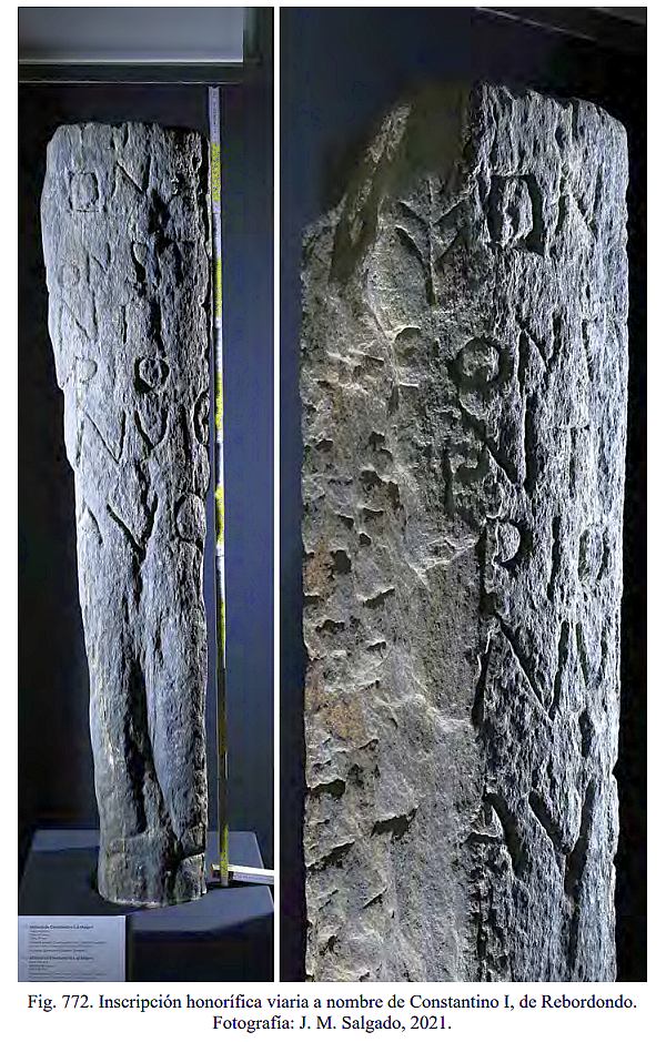 Évora a Vila Viçosa por São Miguel de Machede e Bencatel Vários indícios apontam para a existência de uma via ligando Évora às pedreiras de mármore de Bencatel e Vila Viçosa. A via seguia por São Miguel de Machede onde apareceram dois miliários. Saindo de Évora pela Porta de Machede, a via seguia talvez pelo bairro das Nogueiras para cruzar o rio Xarrama junto da Quinta do Sande, continua pela Quinta da Retorta, cruza o rio Degebe no lajeado junto da Quinta Velha e continua pelo Monte da Fonte Boa do Degebe, sítio romano da Quinta do Morgadinho, marco geodésico da Galvoeira/Pedras Brancas rumo à travessia da ribeira de Machede, dirigindo-se depois pelo Monte da Amendoeira rumo ao Monte da Barrosinha, onde André Carneiro e Francisco Bilou viram um miliário anepígrafo, no caminho de acesso ao monte ao km 41 da EN254, entretanto desaparecido (!), passando entre duas importantes villae, Courelas da Toura a norte e Herdade da Morgada a sul, onde apareceu uma placa funerária (FE 120) (Bilou, 2000a). São Miguel de Machede (12 m.p.; segue a norte da povoação pelo Monte do Almo e da Aldeia, onde existe um miliário anepígrafo que assinalaria a 12ª milha) Travessia da ribeira da Pardiela (continua por Foros do Queimado, Monte dos Frades e Monte da Laje, entroncando pouco depois na EN254, cruza a ribeira do Freixo e segue junto do Monte do Zambujal e do antigo albergue da «Venda do Redondo») Redondo (18 m.p. ao Km 27 da EN254, onde toma o estradão de terra à esquerda que segue para o fortim romano do Monte do Almo, provável posto de controlo da via junto da travessia da ribeira de São Bento, seguindo portanto a noroeste de Redondo; o trajecto continua pelos montes do Hospital, da Fonte da Cal, da Amendoeira e de Rial, cruza a EN381 e segue para Horta da Velhinha até entroncar novamente na EN254 ao km treze, seguindo por esta até ao Alto das Cabeças, onde volta a derivar para cruzar a ribeira de Lucefecit em Galvões, seguindo depois junto da extinta Ermida de Santa Ana e do Monte da Galharda) Bencatel (21 m.p.; vicus no sítio de «Vilares» na Herdade da Galharda associado à extracção de mármore com pedreiras em Monte do Regoto, Monte da Lagoa, Monte d'El-Rei e Herdade da Vigária; junto do vicus apareceu uma inscrição dedicada a Fontano e Fontana na Fonte Terrenha situada no sítio da «Aldeia das Freiras», actual Azenha das Freiras; a via cruzava uma outra vinda de Estremoz para Alandroal rumo ao Guadiana) Vila Viçosa (25 m.p.; miliário de Constantino Magno achado nas redondezas, mas em sítio impreciso, IRCP 676, actualmente no Museu Arqueológico local que guarda também o miliário do Monte de Alcobaça; três inscrições dedicadas a Proserpina na Ermida de Santiago, Largo dos Capuchos, onde deveria existir um santuário, pode indiciar a continuação da via pela actual rua da Carreira até São Romão de Ciladas, onde entronca na via que corria entre Terrugem e Juromenha)