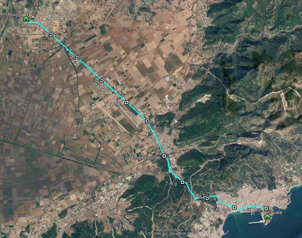 Despite its almost complete destruction the original path is still recognizable all the way from Philippi to Neopolis, with some stretches cut or converted to modern roads. Consequently, it is possible to track down the mile counting of the all road. Measuring the distance between both end points shows that this stage was also of 10 miles, the most common value between stations in ancient routes. The resulting map is presented below: